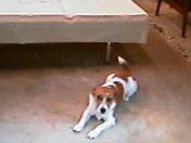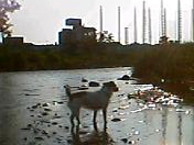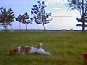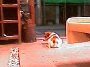 20050829 はれ 店では寝てばかりのだんごも朝の散歩は水遊びしたりBとじゃれたり、 |