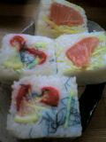 | なんだかおもちゃみたいな金沢の押し寿司、赤は桜エビ、青いのは海藻(たぶん・・・)、黄はしょうがとレモン、ピンクは鮭。 |