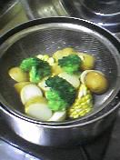 | 最近はまってるのがコレ、野菜を切ってザルにのっけて蒸して、うまいドレッシングで食べる。これだと、どれだけでもモリモリ野菜が食べれる、ジャガイモも数分で中まで火が通るし、早いし安いし旨い!野菜は、その日スーパーの安いのばっかり、本日はダイエーにて90円セールの日、じゃがいも1袋・ブロッコリー・とうもろこしで270円の夜ごはん |